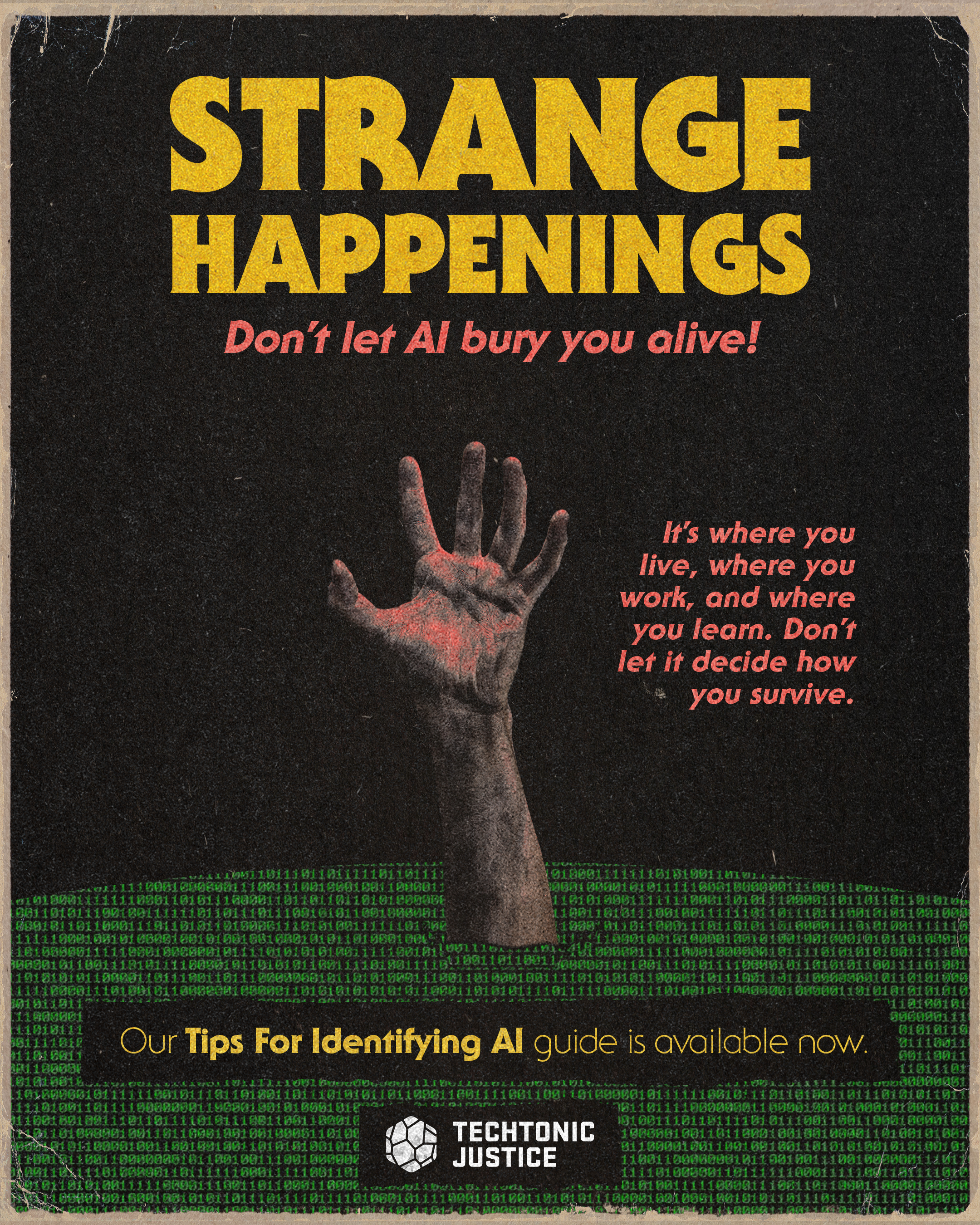 A horror movie poster-inspired spooky season social post for TechTonic Justice to promote their Tips for Identifying AI report